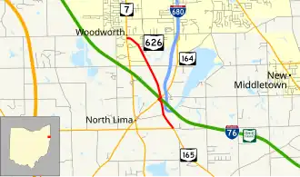 State Route 626 begins at the intersection of SR 165 and County Road 26 (East South Range Road) approximately one and a half miles (2.4 km) southeast of North Lima. Running northwesterly from that intersection, the two-lane state route passes a number of houses, with woods abutting the roadway along the way. At Miley Road, the highway turns to the north-northwest, and passes just to the west of the partial I-680 interchange off of the Ohio Turnpike (I-76). SR 626 then bends to the northwest, and comes into a T-intersection with SR 164. Here, SR 626 turns to the northeast, and runs concurrently with SR 164 for less than 0.1 miles (0.16 km) to cross the Ohio Turnpike, then resumes its solo trek to the northwest. The route passes by a couple of commercial buildings as it departs the intersection, then travels amidst a blend of wooded terrain and open fields with scattered homes along the way. SR 626 intersects County Road 30 (East Calla Road), then continues in a northwesterly fashion, crossing railroad tracks and then passing by the Kreps Road intersection. Next, the highway passes into a more heavily residential setting, and intersects a number of side streets. Finally, SR 626 passes a couple of commercial businesses as curves to the west, passes a former alignment of the route (when it ended at a five-point signalized intersection), and ends approximately two miles (3.2 km) south of Boardman where it meets SR 7 in the community of Woodworth.[3]