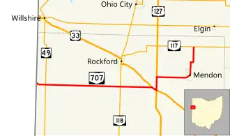State Route 707 (SR 707) is a 19.45-mile-long (31.30 km) east–west state highway in the western portion of the U.S. state of Ohio. The western terminus of SR 707 is at the Indiana state line approximately 7.50 miles (12.07 km) southwest of Willshire, where it transitions into Indiana State Road 218. The eastern terminus of SR 707 is at SR 117 nearly 3 miles (4.8 km) north of Mendon.