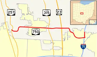 SR 750 was established in 1937, ran from SR 257 to its junction with SR 315.[4][5] In 1997, SR 750 was extended eastward from SR 315, crossing the Olentangy River and US 23 via Powell Road, then following Polaris Parkway around to a new eastern terminus at I-71 in the far northern end of Columbus.[6][7] Ten years later, a new interchange was built for Gemini Place at I-71, north of SR 750.[8][9] The interchange would relieve traffic in the area.[10] The next year, SR 750's westernmost portion was re-routed to the south, onto an all-new alignment that brought its western terminus in line with the intersection of SR 257 and County Road 126 (Glick Road), after an expansion to the Columbus Zoo.[11] In September 2013, a slope stabilization project began for SR 315, and turn lanes are currently being added for SR 315 and SR 750's intersection.[12]