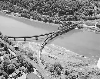 The current bridge is the fourth structure at the current location. The Allegheny Valley Railroad reached Venango City, across the Allegheny from Oil City, on January 8, 1868.[1][2] It completed a new bridge over the river on February 2, 1870.[3] The railroad replaced the bridge with a new 678-foot (207 m) wooden Howe truss bridge in 1880.[1] The Allegheny Valley Railway, successor to the Allegheny Valley Railroad, replaced this bridge in 1895 with a steel bridge.[4]
