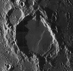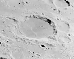 The interior of this crater has become flooded by basaltic lava, producing a nearly level, featureless surface with a low albedo. A number of tiny craterlets mark this surface, particularly in the northwest. The surrounding mountain ring has been eroded by impacts, and is somewhat distorted from a true circular shape. There is a wide bulge in the rim toward the southeast, where the surface is lower and more rugged. Slight bulges also exist to the southwest and northwest. The rim is marked by a number of tiny impacts along the edge, particularly to the southwest.