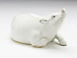 An okimono may be a small Japanese carving, similar to, but larger than netsuke. Unlike netsuke, which have a specific purpose, okimono are purely decorative and are displayed in the tokonoma. This view has however sometimes been questioned, with some suggesting that okimono often had both utilitarian and decorative purposes, especially before Western influence.[3] An okimono can be made out of wood, ivory, ceramic or metal.