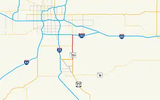 State Highway 77H is a spur that runs from US-77 in Norman, north through a small piece of unincorporated Cleveland County and Moore, to Oklahoma City. The state highway designation ends at I-240, although Sooner Road continues north to its terminus at I-35, I-44, Turner Turnpike, Kilpatrick Turnpike, and SH-66.