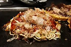 Okonomiyaki (Japanese: お好み焼き; ⓘ) is a Japanese teppanyaki savory pancake dish consisting of wheat flour batter and other ingredients (mixed, or as toppings) cooked on a teppan (flat griddle). Common additions include cabbage, meat, and seafood, and toppings include okonomiyaki sauce (made with Worcestershire sauce), aonori (dried seaweed flakes), katsuobushi (bonito flakes), Japanese mayonnaise, and pickled ginger.