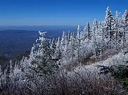 Old Black gets its name from the dense Southern Appalachian spruce–fir forest that covers its higher elevations.[7] From afar, this forest takes on a dark green character, especially in cooler months when contrasted with the brown hardwood forest in lower elevations. This forest also adds to Old Black's blunt appearance—that of a low pyramid with a wide base.