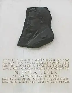 There are two commemorative plaques on the walls of the Old City Hall. One was put there in 1917 by the Brethren of the Croatian Dragon, a cultural heritage society, enumerating several notable events held at the building, and the other depicts a relief of Nikola Tesla, commemorating his proposal to build an alternating current power station, which he made to the city council.[2] The plaque quotes Tesla's statement, given in the building on 24 May 1892, which reads: "As a son of this country, I consider it my duty to help the City of Zagreb in every way, either through counsel or through action" (Croatian: "Smatram svojom dužnošću da kao rođeni sin svoje zemlje pomognem gradu Zagrebu u svakom pogledu savjetom i činom"). Tesla had visited Zagreb at the invitation of mayor Milan Amruš and presented his idea of installing an electric street light system powered by a hydroelectric power plant at Plitvice Lakes. His idea was rejected and the city council chose to build a power plant near Ozalj instead.[3]