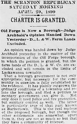 The history of Old Forge can be traced back to 1789 and Dr. William Smith, who was an army surgeon in the American Revolutionary War.[7] During the 1820s, Charles Drake operated the only stagecoach inn between Wilkes-Barre and Carbondale. Drake's son, Ebenezer, secured a post office for Old Forge in 1848, where he served as postmaster until 1885. On May 26, 1871, Old Forge Township was designated, as it previously had been part of Lackawanna Township. Old Forge Borough was incorporated on May 2, 1899.