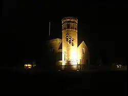 The lighthouse "grew out of the fog station."[1][13] In March 1891, Congress finally authorized the funding for a light station and the board acted quickly. Bidding was difficult, but in 1892, "on a foundation of ashlar limestone, the tower and attached keeper’s dwelling were both constructed of Cream City brick, trimmed with Indiana Limestone, by general contractor John Peter Schmitt of Detroit. The double-walled cylindrical tower was laid with an outside diameter of 13 feet 4 inches (4.06 m), and as each course was added, rose to a height of 45 feet (14 m), surmounted by a circular iron gallery and an 8-foot-8-inch (2.64 m) diameter watch room, which was in turn capped by a prefabricated octagonal iron lantern."[14] The lens is a fourth order Fresnel Lens.