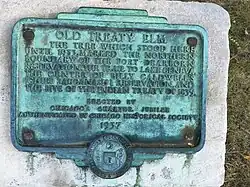 The Old Treaty Elm marked the Northern boundary of the Fort Dearborn Reservation, the approximate edge of the Billy Caldwell Reserve, and the trail to Lake Geneva. The tree was located in the Sauganash neighborhood of Chicago, Illinois, and stood until 1934.[1] The marker is placed several feet west of the actual location of the trunk of the tree, which stood approximately in the middle of what is now Kilbourn Avenue, just north of Rogers Avenue, which is the Old Indian Boundary Line.