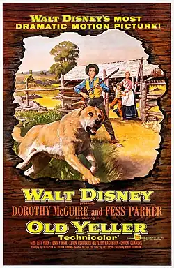 Old Yeller is a 1957 American Western drama film directed by Robert Stevenson and produced by Walt Disney. It stars Dorothy McGuire and Fess Parker, with Tommy Kirk, Kevin Corcoran, and Chuck Connors. It is about a boy and a stray dog in post-Civil War Texas. The film is based upon the 1956 novel of the same name by Fred Gipson.[2] Gipson also co-wrote the screenplay along with William Tunberg.