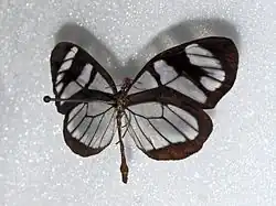 Oleria flora has transparent wings with brown veins and a brown and orange border on the outer edge of the hindwings.[4]
