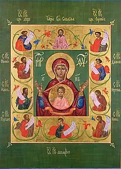 At the age of 13, Olga Liashenko painted her first icon of Holy Mary. In later training, she learned a variety of icon painting techniques, including tempera. For her Master's thesis, Olga Liashenko painted the icon “Знамение. Курская Коренная (Our Lady of the Sign (Kursk Korennaia))” for the Nativity Church in Ulanok near Kursk, Russia. Within the central part of the icon, the Mother of God is surrounded by saints and floral ornaments. During the writing of the icon, she used image canons based on Byzantine iconography. Olga Liashenko uses natural pigments to paint in egg tempera on wood. The haloes traditionally have gold leaf gilding.[4]