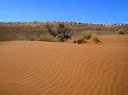 The Witsand Nature Reserve has white sand dunes which are surrounded by contrasting red sand dunes. The reserve spans over 2,500 hectares of land with dunes up to 100 metres high and 10 kilometres in length. These white dunes are also known as the Kalahari Roaring Sands due to the sounds they make under certain weather conditions. The colouring of the dunes is believed to have been formed by numerous hills beneath the sand. Wildlife that can be observed in the nature reserve include meerkats, pangolins and aardvarks. Larger antelope such as the red hartebeest, springbok, gemsbok and kudu can also be seen.[3] Nocturnal wildlife includes the porcupine, aardwolf, bat-eared fox, Cape fox, genet, springhare and owl.[2]