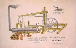 Steam engines appeared in the United States as a source of power in the late 18th century, and living in Delaware and Philadelphia meant Evans was exposed to early examples of their application there. John Fitch had launched the first rudimentary steamboat onto the Delaware River in the late 1780s,[41] and the Philadelphia waterworks was by 1802 operating two low-pressure steam engines to pump water from the Schuylkill River, but these were rare examples and most instances of this new technology were to be found in Europe.[42] Much of the development of steam power had occurred in Great Britain, with Thomas Newcomen and James Watt instrumental in developing and commercializing steam power there and elsewhere in Europe, with several hundred of machines operating there in industrial and labor-saving applications by 1800.[43]
