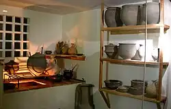 Unlike the aenum or cauldron, which hung over the fire from chains, the olla had a flat bottom for resting on a hot surface, though it might also be placed directly on logs or coals in rustic cookery.[10] The kitchen reconstructed at the House of the Vettii from Pompeii shows a large olla set on a tripod on the stove.[11]
