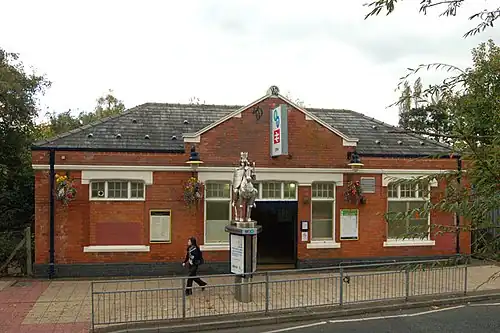 Olton railway station serves the Olton area of the town of Solihull, in the West Midlands of England. The station is operated by West Midlands Trains. The entrance, seen in the centre where the station's booking office is located, leads into a tunnel which runs under the tracks providing an access staircase and lift to the island platform. The station also has a car park and bicycle racks.
