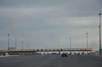Olympia Odos is a toll motorway system on the Peloponnese in Greece. Starting from Eleusis in the Athens metropolitan area, the Olympia Odos motorways follow the Gulf of Corinth to the Rio–Antirrio bridge and the city of Patras, and along the Ionian Sea coastline, in future down to Tsakona (near Meligalas) in the southwestern Peloponnese where it will intersect with the A7 motorway.