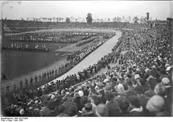 Work on the stadium, the Deutsches Stadion (German: German Stadium), began in August 1912. When it opened, it held over 18,500 spectators, and had a seating capacity of 11,500.[2][4] March decided to bury the stadium in the ground ("Erdstadion", in German). On 8 June 1913 the stadium was dedicated with the release of 10,000 pigeons. 60,000 people were in attendance.[1][5] The stadium contained a 650-foot running track surrounded by a 720-yard cycling track. A 108-yard swimming pool was located on the outer edge of the cycling tack.[1] The stadium also was alternatively known by the names Grunewaldstadion and Berlin Stadium. The stadium was inaugurated 15 May 1913, following a mere 200-day construction schedule. The opening ceremony of the stadium occurred 8 June 1913. Otto March had died April of that year, thus he was unable to see the opening of the stadium.[2]