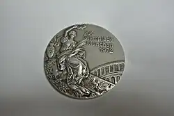 The 1900 Summer Olympics is unique in being the only Olympic Games to feature rectangular medals, which were designed by Frédérique Vernon.[9] Gilt silver medals were awarded for 1st place in shooting, lifesaving, automobile racing and gymnastics.[10][11] Second place silver medals were awarded in shooting, rowing, yachting, tennis, gymnastics, sabre, fencing, equestrian and athletics.[12] Third place bronze medals were awarded in gymnastics, firefighting and shooting.[13][14] In many sports, however, medals were not awarded. With most of the listed prizes being cups and other trophies.[15]