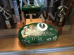 Considered one of the greatest rivalries in the state of Utah,[3] "the Rock" is the prized rivalry trophy between Olympus and Skyline football. It is a football-shaped piece of granite, which local lore states was taken from Mt. Olympus in 1962, prior to the first contest between the two schools. The winning school paints the Rock in their colors and displays it in their trophy case. At the conclusion of the 2024-25 season, Olympus maintains the edge, 30-27–1.