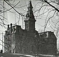 On November 10, 1859, Omaha Central High School began as Omaha High School in the Nebraska Territory capitol building. In 1869, after the territorial government was removed from Omaha and moved to Lincoln, the capitol building was donated to the City of Omaha by the Nebraska state government for educational use only. In 1870, it was demolished. In 1872, it was replaced by a four-story building that hosted kindergarten through twelfth grades, designed by Gurdon P. Randall[4][5] in the Second Empire style. In 1900, a new building was begun that encircled the second school, which was dismantled by 1912. Kindergarten through eighth grade were moved to the neighboring Central Elementary School. A gym was added to Central in 1930, and this building is still in use today.[6]