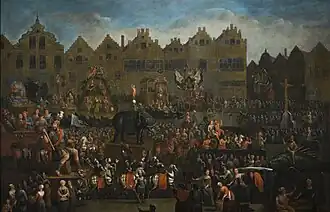 In the 15th, 16th and 17th century the Ommegang of Antwerp was the most important in Flanders.[1] The "Onze Lieve Vrouwommegang" consisted originally of two events: the first celebrated the religious feast of the Assumption of Mary. The second was a large, opulent secular participation of the guilds, crafts and chambers of rhetoric, each of which contributed a float to a procession through the streets of Antwerp.[2] Some floats contained references to events of the preceding year.[1] There was considerable rivalry between the guilds in their efforts to provide the most splendid display.[2]