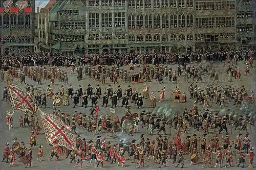 Through the following decades, what was originally a religious procession took on gradually a more worldly outlook. The Ommegang of 1549 corresponds to a golden age of the procession. From the mid-16th century, the Ommegang not only celebrated the miraculous legend, but from 1549, became intertwined with the Joyous Entry of Holy Roman Emperor, Charles V, and his son, Philip II, then-crown prince of the Seventeen Provinces of the Netherlands.[4] On that occasion, Brussels' elites wished to honour the Emperor and his son by organising spectacular equestrian parades in the Sablon and on the Grand-Place/Grote Markt. The Ommegang thus developed into an important religious and civil event in the city's annual calendar.[5]