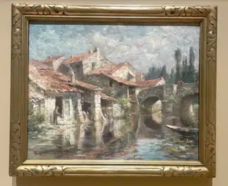 On a French River is an impressionist oil painting on canvas painted by the artist Emma Lampert Cooper during the late 1800s. It is a landscape painting that depicts a river scene in Parthenay, France. It is part of the permanent collection at the Memorial Art Gallery (MAG) in Rochester, New York.[1]Emma Lampert Cooper's husband, Colin Campbell Cooper,[2] also produced similar paintings in the same location when they traveled together. Specifically, the paintings titled Port St. Jacques, Parthenay, France, and A View of a European Village. Both of these paintings have been auctioned in the past and are privately owned.[3][4]