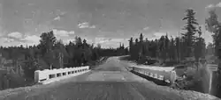 While Highway 11 was extended farther north and west between the 1920s and 1960s, numerous projects took place along the sections between Barrie and Cochrane during that period to either realign the highway to improve the geometry, or to bypass built up areas. The largest bottleneck along the highway in the 1940s was between Washago and through Gravenhurst, where construction began in 1947 to realign 23 kilometres (14 mi) between the two towns, including a new high-level bridge over the Trent–Severn Waterway.[79][80] The original bypass of Gravenhurst, along what is now Bethune Drive, opened in 1948,[81] while reconstruction of the remainder of the route between Washago and Gravenhurst was completed in 1949.[80]