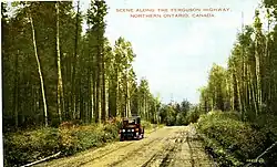 The route of the new road between North Bay and Cobalt was cleared by April 1925,[38] after which construction began in August from both North Bay as well as Cobalt.[39] The new gravel highway was officially opened on July 2, 1927,[37] by Minister of Lands and Forests William Finlayson. He suggested at the opening that the road be named the Ferguson Highway in honour of premier Ferguson. The name was originally suggested by North Bay mayor Dan Barker.[40] Despite the official opening, a section between Swastika and Ramore wasn't opened until August.[41] The Ferguson Highway name was also applied to the Muskoka Road between Severn Bridge and North Bay.[37] Although the route from North Bay to Cochrane was passable, it was not an adequate road in many places. Construction continued for several years to build bypasses of sharp turns, steep grades, awkward rail crossings, and other obstacles. The Ferguson Highway was extended from Cochrane to Kapuskasing by 1930, and later to Hearst in 1932.[42][43]