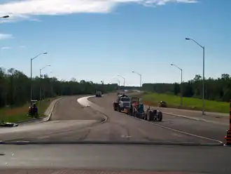 In 2001, the Georgian Triangle Area Transportation Study determined that traffic levels along Highway 26 both east and west of Collingwood were exceeding capacity. The Simcoe Area Transportation Network Needs Assessment repeated this analysis the following year.[21] Subsequently, work on a new bypass east of Collingwood began on April 11, 2003.[22] The old route was a dangerous section of road with numerous intersecting side streets and private residences with direct highway entrances, while the bypass is a fully-controlled access four-lane divided highway without any at-grade crossings. The new alignment has the highway veer west in the west end of Wasaga Beach, and from a roundabout with Mosley Street it runs parallel to and south of the old route to a roundabout at Poplar Sideroad, near the eastern town limits of Collingwood. The bypass opened on November 14, 2012.[23] The former route is now known as Beachwood Road from Collingwood to Mosley Street in Wasaga Beach. The remaining section of the former alignment south of Mosley Street has been renamed Lyons Court.[24]