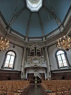 The church was designed by Bartholomeus Drijfhout and Pieter Post and was built between 1648 and 1667.[1] After Drijfhout died in 1651, the building was continued under the Leiden architect Arent van 's-Gravesande, who had just completed the Marekerk in Leiden. The white organ was built by Gebr. de Rijckere from Kortrijk in 1782.[1] Two stained glass windows from 1664 still exist in the church, and the klokkenstoel contains a bell by Claes Noorden and one by Jan Albert de Grave, 1715.[1]