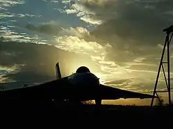 Now alone, Withers flew on to the Falklands. He made his approach at low level, dropping to 300 feet (91 m) before climbing to 1,000 feet (300 m) for the bomb run 40 miles (64 km) from the target.[32] To verify their position and minimise the risk of civilian casualties, the H2S radar was successfully locked on to the 2,313-foot (705 m) peak of Mount Usborne, 33 miles (53 km) west of Stanley, before the automated bombing control system was engaged.[41] Withers made the final approach at 10,000 feet (3,000 m), with an airspeed of 330 knots (610 km/h). The Vulcan's electronic countermeasures defeated the radar systems controlling the defending Skyguard anti-aircraft cannons. The twenty-one bombs were dropped. Once all were away, Withers put the Vulcan into a 60-degree bank to the left, subjecting the crew to 2 g (20 m/s2), twice the force of gravity.[42] Sea Harriers of 801 Naval Air Squadron (NAS) were held at readiness on board the aircraft carrier HMS Invincible to protect the Vulcan, but were not required as no Argentine aircraft were in the area at the time of the attack.[43] The Sea Harriers went into action shortly after the Vulcan raid. Two of the aircraft flew over Port Stanley airport to photograph the damage caused by the Vulcan.[44]