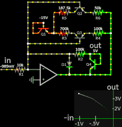 The schematic shown for a "temperature-compensated three-segment compression function"[8][9] produces a gain compression transfer function where each subsequent line segment reduces the steepness of the transfer function. For small signals, transistors Q2 and Q3 produce very little base current, and so the circuit's gain is determined just by the feedback resistance of R2 divided by the input resistance of R1. Once the output voltage exceeds around 2 V (whose exact voltage depends on R3 and R4 and the -15 V supply), then Q3 saturates, so the circuit's feedback resistance is determined by R4 in parallel with R2, reducing the gain. As the output voltage increases more, Q2 will saturate, so the circuit's gain is again reduced by the additional inclusion of R6 into the parallel feedback resistance. Temperature-compensation transistors Q4 and Q1 cancel out the temperature-dependent p–n junction base-emitter forward voltage drop of Q3 and Q2. Additional linear segments can be added using additional copies of the resistor-transistor-resistor chains (like the chain R5, Q2, R6 or the chain R3, Q3, R4 but with different values) in a similar manner to further compress the input. This circuit's compression function only works for negative inputs. Diode D1 forces the output to zero if a positive input is applied.