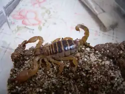 Opistophthalmus boehmi, the yellow forest scorpion, is a small (around 5 cm - 2 in) scorpion native to southern Africa. It is a burrowing scorpion which can create intricate tunnels and spend days buried at the bottom of its lair.