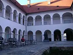 After a large earthquake in the 19th century, a classicist porch with a tympanum and Doric columns was added to the castle. Inside there is a well-preserved chapel with illusionist murals and an illustrated baroque altar.