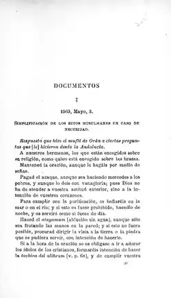 Al-Wahrani drafted the fatwa in response to a request of legal opinion, in other words, as a responsum, to Muslim petitioners who wished to learn if they could continue to live in Christian Spain.[1][4][27] The recipient of the fatwa is not named.[1] The commonly accepted date of the composition of the fatwa is 1 Rajab 910 AH, as this was the date that appears in most of the surviving manuscripts.[28] This day in the Islamic calendar corresponds to around 8 December 1504.[29] One manuscript added "3 May 1563" in addition to 1 Rajab 910, which would have been a date conversion error, but both Stewart and the historian L. P. Harvey have suggested that the 1563 date might have been the time of the translation.[29][6] One other manuscript gives "Rajab 909", which was probably a copying error.[28]