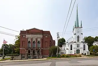 The historic district is roughly linear, extending north–south along North and South Main Streets from School Street in the north to River Street on the south side of the Miller River. It extends for a short distance along East and West Main Streets. Included in its roughly 12 acres (4.9 ha) are 37 historically significant buildings, most of which are commercial brick or wood-frame buildings in a variety of styles. Also included are the town hall (built 1868), two churches, railroad-related infrastructure including a surviving freight house. At the northern end of North Main Street are a few period residences, including an ornate Italianate French House that now serves as the home to the local historical society. The Grand Army of the Republic Hall was torn down in the early 1990s.[2]