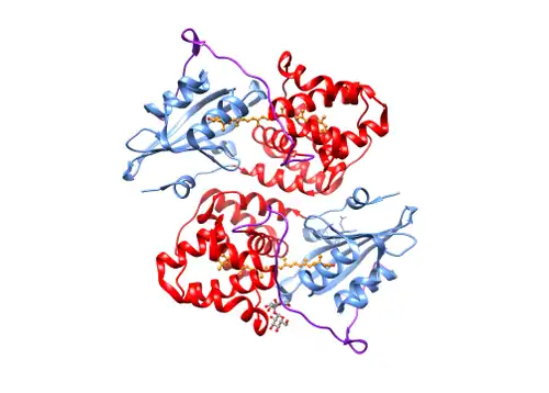 Orange carotenoid protein (OCP) is a water-soluble protein which plays a role in photoprotection in diverse cyanobacteria.[1] It is the only photoactive protein known to use a carotenoid as the photoresponsive chromophore. The protein consists of two domains, with a single keto-carotenoid molecule non-covalently bound between the two domains. It is a very efficient quencher of excitation energy absorbed by the primary light-harvesting antenna complexes of cyanobacteria, the phycobilisomes. The quenching is induced by blue-green light. It is also capable of preventing oxidative damage by directly scavenging singlet oxygen (1O2).