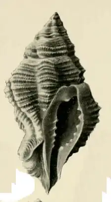 The siphonal canal is open, short, recurved, the canal-tips of previous apertures enclosing with a frill a false umbilicus. The aperture is narrow-oval. On the right side there are seven evenly spaced entering ridges which penetrate a short distance only. Externally they end abruptly at a circumferential groove. Posteriorly the aperture ends in a furrow followed by a tubercle. The upper part of the inner lip is clear of obstructions, but the lower is occupied by five strong and deeply penetrating spiral ridges which do not reach the free edge of the columellar lip. [2]