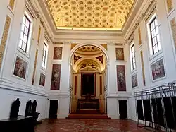 The ground floor of the exterior is made from large stone blocks with masks sculpted in the arch keystones. The second story has a more sober facade with Corinthian pilasters. The confraternity or Compagnia del SS. Crocifisso was also called the Company of the bianchi or whites due to their white processional gowns. Their main charity was to accompany and minister to those condemned for execution. The interiors have a few stucco sculptures completed by Serpotta and his family, The main meeting room for the members was frescoed in 1776 by Gaspare Fumagalli in a neoclassical style. [1]