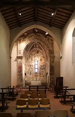 The simple exterior is made of semi-rough stones with an oculus. The interiors have frescoes on the Life of St Anthony Abbot (1407) by Bicci di Lorenzo. One of the frescoes, Temptation of St Anthony, depicts a vista of 15th-century Pescia. A 13th-century wooden sculptural group depicts the Deposition.[1][2]