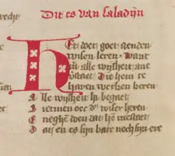 Outside of France, the Ordene was most influential in Italy. It is paraphrased in a cycle of sonnets by Folgore da San Gimignano and the tale is incorporated into three Italian prose works: Bosone da Gubbio's Fortunatus Siculus, Anton Francesco Doni's Novelle and the Novellino. There is also a Middle Dutch version by Hein van Aken, entitled Van den Coninc Saladijn ende van Hughen van Tabaryen. This version includes the Franco-Picard prologue (which differs from the Anglo-Norman).[21] It is preserved in three manuscripts.[22] The Dutch prose work D'ystorie van Saladine printed by Arend de Keysere around 1480 merely contains the character of Hugh of Tiberias but is otherwise unrelated to the Ordene.[21]