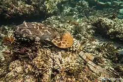 The wobbegong genus as a whole normally feeds on demersal teleost fish and smaller elasmobranchs, but O. hutchinsi additionally preys on cephalopods, which are squids, nautilus or octopus.[4] The western wobbegong shark uses its electrosensing capabilities to sense and capture prey.[4] Their electrosensitivity is highly accurate behind their heads, which allows the wobbegong to accurately strike and capture prey even when the prey is not visible.[4] Because wobbegong sharks wait for prey on the seafloor, their electrosensing capabilities are essential in detecting prey swimming near them.[4] The western wobbegong shark employs a "sit-and-wait" feeding strategy, meaning that they wait for prey to swim by and then strike quickly and accurately with the help of their electrosensing abilities.[4] Their feeding strategy is unusual for sharks: wobbegongs ambush prey during the daylight, because their well-camouflaged body makes it difficult for prey to detect them when they're motionless on the seafloor.[4]