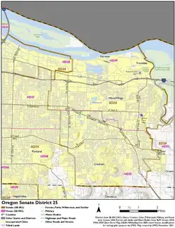 District 25 of the Oregon State Senate comprises parts of Multnomah County centered around the city of Gresham. The district is composed of Oregon House districts 49 and 50. It is currently represented by Democrat Chris Gorsek of Troutdale.