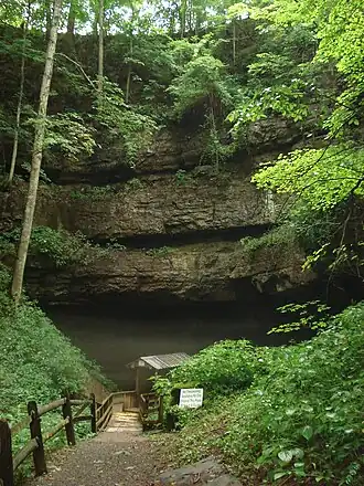 In 1973, the Organ Cave System—also known as the Organ–Hedricks Cave System[2]—was registered as a National Natural Landmark for being "the largest cave system in the State, containing many caves, one of which is Organ Cave.[3] Noted also for its saltpeter troughs and vats." (It is now the third-longest known cave in the state, after the Friars Hole Cave System in the same county and the Hellhole System in Pendleton County.[4]) Organ Cave has also been listed on the National Register of Historic Places since 2005.[5]