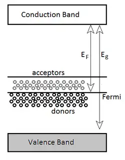 where Nc and Nv are the densities of states at the bottom of the conduction band and the top of the valence band, respectively, Ec and Ev are the corresponding energies, EF is the Fermi level, kB is the Boltzmann constant and T is the absolute temperature. Addition of impurities into the semiconductor, or doping, produces excess holes or electrons, which, with sufficient density, may pin the Fermi level to the impurities' position.[9]