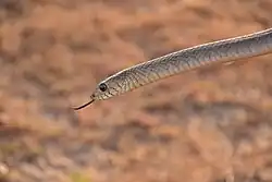 Ptyas mucosa, commonly known as the Oriental rat snake,[2] dhaman or Indian rat snake,[4] is a common non-venomous species of colubrid snake found in parts of South and Southeast Asia. Dhamans are large snakes. Typical mature total length is around 1.5 to 1.95 m (4 ft 11 in to 6 ft 5 in) though some exceed 2 m (6 ft 7 in). The record length for this species was 3.7 m (12 ft 2 in), second only to their cousin Ptyas carinata among living colubrid snakes.[5][6] Despite their large size, oriental ratsnakes are usually quite slender with even a specimen of 2 m (6 ft 7 in) commonly measuring 4 to 6 cm (1.6 to 2.4 in) only around in diameter.[7] Furthermore, the average weight of ratsnakes caught in Java was around 877 to 940 g (1.933 to 2.072 lb), though larger males of over 2.3 m (7 ft 7 in) (which average mildly larger of the two sexes in the species) may easily weigh over 2.5 kg (5.5 lb).[8] Their color varies from pale browns in dry regions to nearly black in moist forest areas. Rat snakes are diurnal, semi-arboreal, non-venomous, and fast-moving. Rat snakes eat a variety of prey and are frequently found in urban areas where rodents thrive.