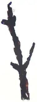 The type species of the genus consists of flattened filaments – perhaps an artefact resulting from post-burial pressure. Their branching is typically at obtuse angles; the irregularly sized grana, which ornament their surfaces, are concentrated at branching points.[1] They are often found as individuals, but sometimes group together into "wefts", as Wellman has termed them.[4] The filaments are septate, with the septa looking like "pinch points" where the tube is slightly constricted – like a twisted balloon. No sign of perforation was visible in the septa;[1] perforate spores are only found in red algae and fungi, but their absence does not preclude their presence in one of these groups: indeed the perforations are difficult to see or image. There are no other diagnostic features of this species that allow classification in any group. Surface ornamentation is a common convergent feature, found for example in liverwort rhizoids and some fungi, so does not help in classification. The specimens recovered are most common in near-shore environments; however, they are never abundant.[1]