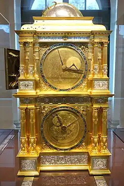 At the court of William IV, Landgrave of Hesse-Kassel two complicated astronomic clocks were built in 1561 and 1563–1568. These use four sides to show the ecliptical positions of the Sun, Mercury, Venus, Mars, Jupiter, Saturn, the Moon, Sun and Dragon (Nodes of the Moon) according to Ptolemy, a calendar, the sunrise and sunset, and an automated celestial sphere with an animated Sun symbol which, for the first time on a celestial globe, shows the real position of the Sun, including the equation of time.[14][15] The clocks are now on display in Kassel at the Astronomisch-Physikalisches Kabinett and in Dresden at the Mathematisch-Physikalischer Salon.